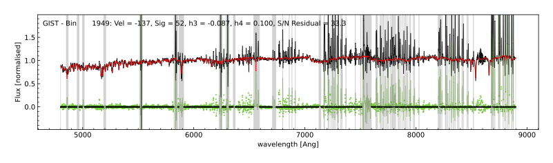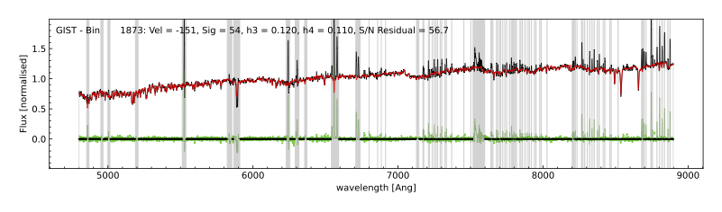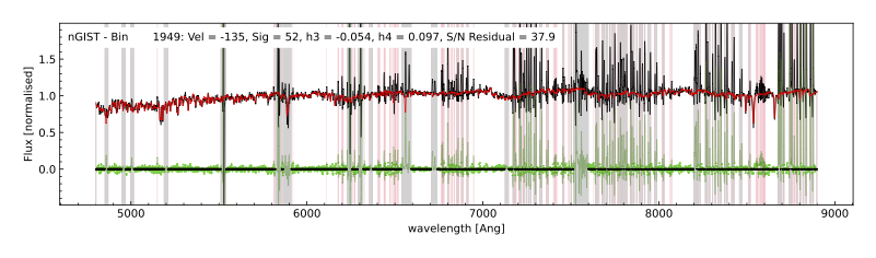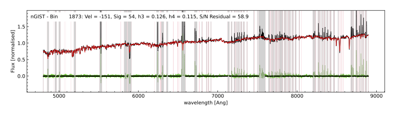 Comparison of the masking and subsequent pPXF best-fit for three Voronoi bins of the GIST (top) and nGIST (bottom) fits from Fraser-McKelvie et al., 2025. In each case the original spectrum of the bin is shown as a black line. The emission and sky line masks provided to pPXF are shown as the shaded grey regions. nGIST additionally performs further cleaning of the spectra, and these additional clipped regions are shown as shaded red regions. The best fit to the stellar continuum is shown in red, and the residuals in green. The derived stellar kinematic parameters for each spectrum are also listed.