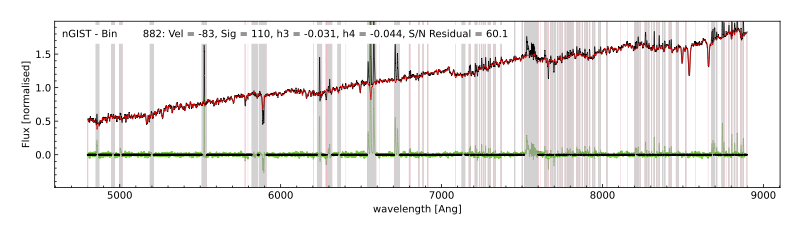 This module uses a multi-step fitting approach to determine the best-fit parameters. nGIST first determines an optimal template set (OPT_TEMP, optional), measures and then applies (optional) a dust correction (DUST_CORR), rescales the noise, and cleans (DOCLEAN, optional) the spectrum of outliers (e.g. >3σ noise, sky lines, and emission lines).