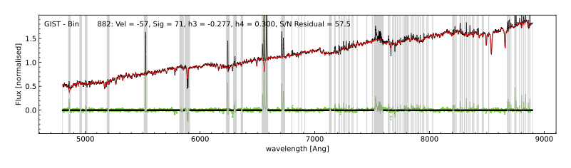 The stellarKinematics module measures the stellar kinematics of the observed spectra. nGIST is currently equipped with one routine that can readily be used by setting the configuration parameter KIN: METHOD to 'ppxf'. In particular, this module employs the pPXF routine of Cappellari and Emsellem (2004). More precisely: